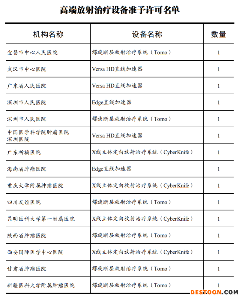 据赛柏蓝器械梳理,本次许可名单包含高端放射治疗设备以及质子放射治疗系统,涉及中国医学科学院北京协和医院、西安国际医学中心医院、武汉市中心医院、广东省人民医院、深圳市人民医院、昆明医科大学第一附属医院等。