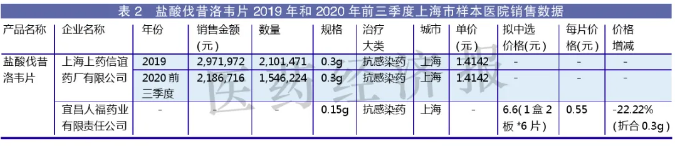 2020年前三季度,盐酸伐昔洛韦在全国样本医院的销售额为5735万元。在上海市样本医院,2019和2020年有销售数据的只有上海上药信谊药厂有限公司的0.3g盐酸伐昔洛韦片,2019年其在上海市样本医院的销售额为297.2万元。