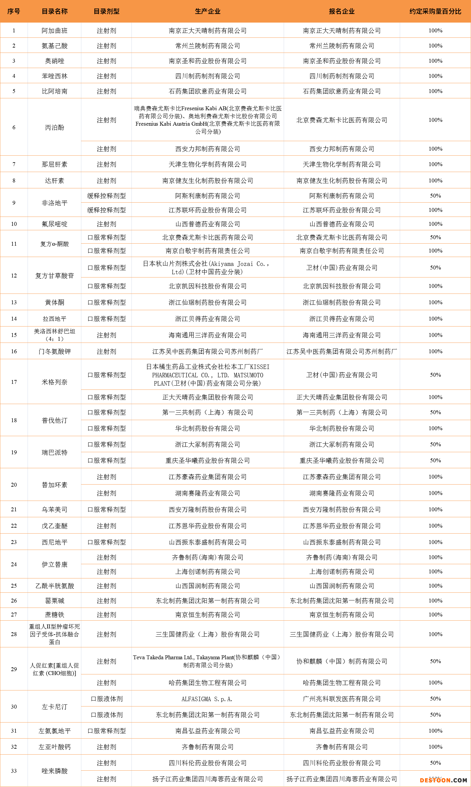 最终中选结果显示,33个品种产生中选结果,7个品种流标。此轮集采中选企业共涉及阿斯利康、费森尤斯卡比、第一三共、正大天晴、江苏豪森、齐鲁、科伦、石药等超40家企业。具体如下图: