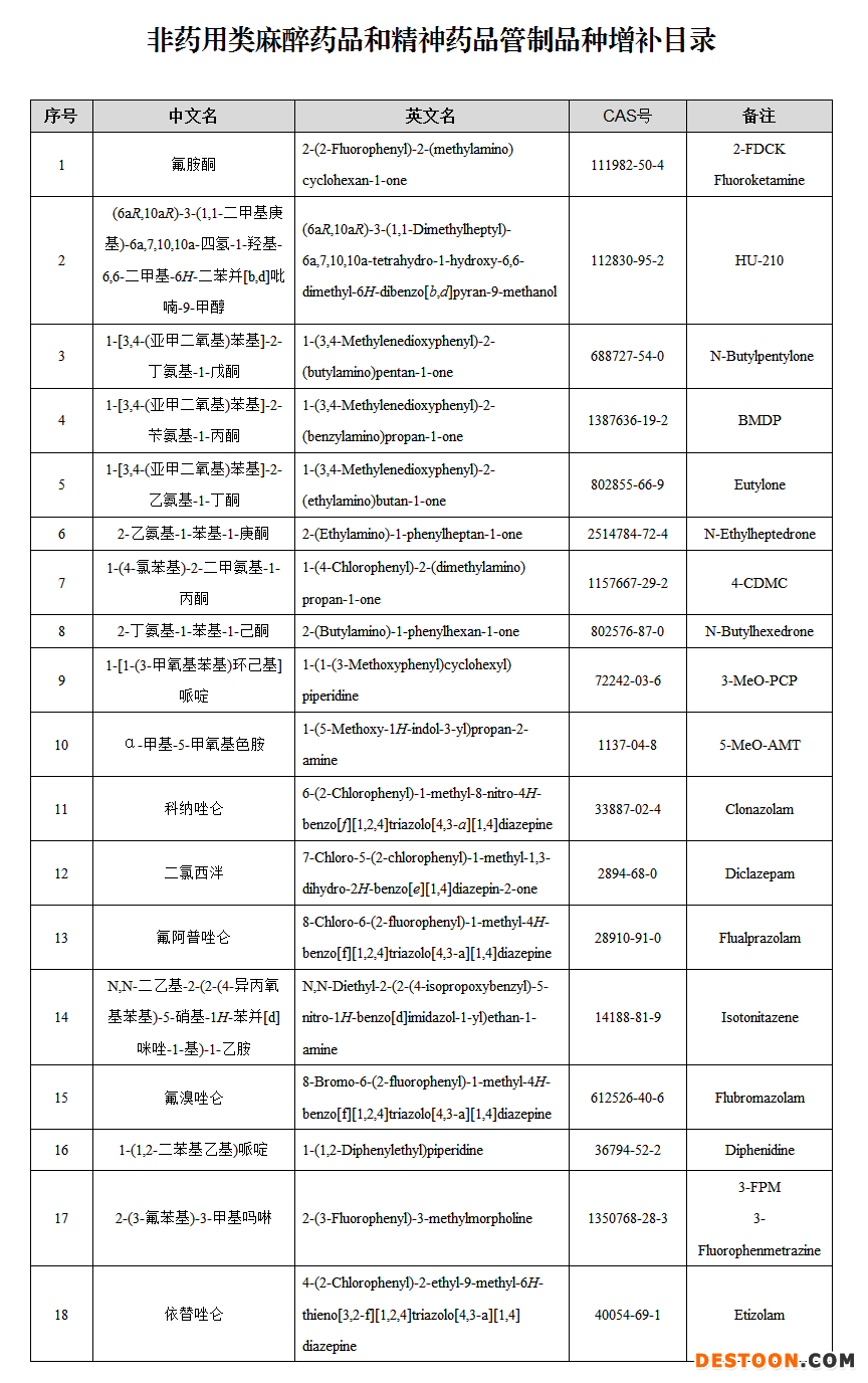 根据《麻醉药品和精神药品管理条例》《非药用类麻醉药品和精神药品列管办法》有关规定,公安部、国家卫生健康委员会和国家药品监督管理局决定将合成大/麻/素/类物质和氟/胺/酮等18种物质列入《非药用类麻醉药品和精神药品管制品种增补目录》。