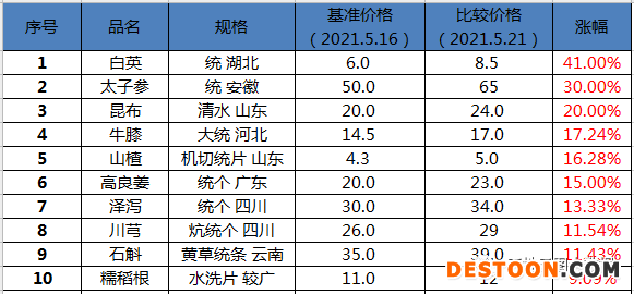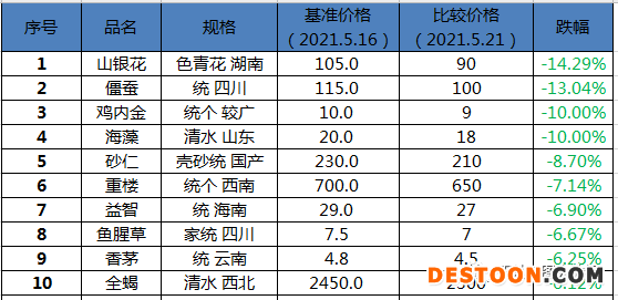 5月24日讯 2021年5月16-21日,天地云图中药产业大数据中心监控的1587个品种(包括相同品种不同品规不同产地,下同)中,上涨品种数50个,下跌品种数38个,其余商品本周价格波动不大。