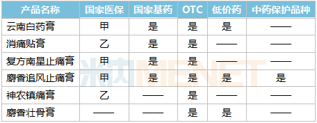 从增速来看,TOP10产品中,云南白药膏、消痛贴膏、复方南星止痛膏等6个产品增速均超10%。其中,有4个是独家产品,麝香追风止痛膏增速最快,超过30%。