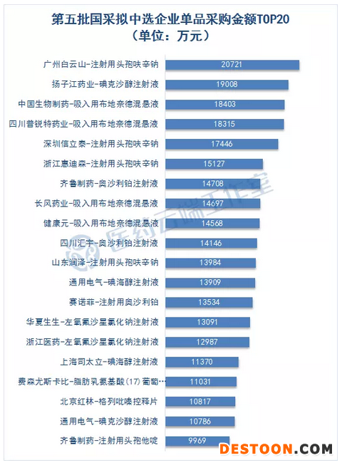 从单品采购金额来看,金额TOP20大多集中在头孢呋辛、布地奈德、奥沙利铂这几个品种。其中广州白云山的头孢呋辛钠首年采购金额最大,2亿元;扬子江的碘克沙醇注射液紧随其后,为1.9亿元。排名第三、第四的则是吸入用布地奈德混悬液,中国生物制药1.84亿,四川普锐特1.83亿。