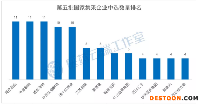中国生物制药、扬子江药业均以中选10个品种位居第二。其次是奥赛康6个,豪森、恒瑞、仁合益康分别中选5个,汇宇、华润、健康元、信立泰则分别中选4个。