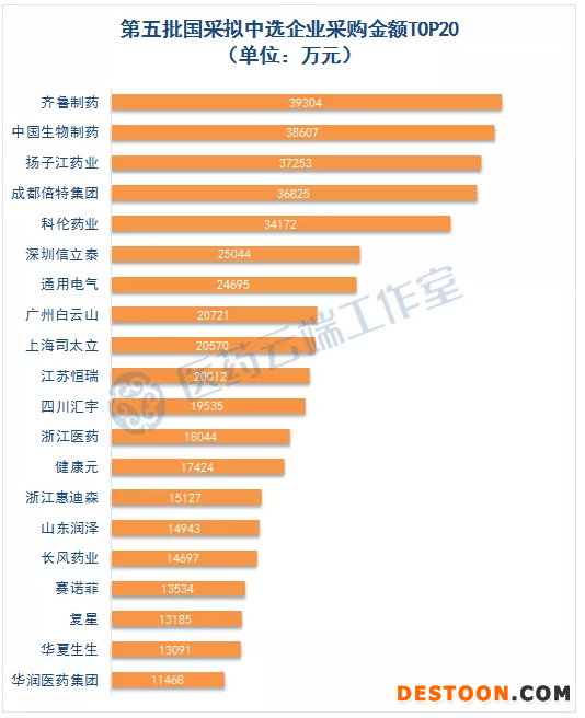不过,由于各家品种降幅不同,中选数量多未必采购金额最高。从采购金额上来看,齐鲁制药成为此次集采的最大赢家,总采购金额达3.9亿元,中国生物制药3.8亿元紧随其后,扬子江药业3.7元位居第三。第四、第五分别是倍特药业(倍特%20普锐特)3.68亿元、科伦药业3.4亿元。恒瑞以2亿元位居第十。
