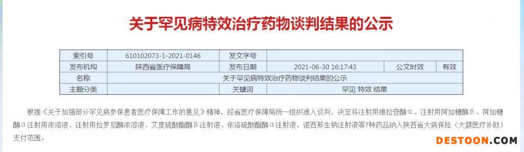 根据《关于加强部分罕见病参保患者医疗保障工作的意见》精神,经省医疗保障局统一组织准入谈判,决定将注射用维拉苷酶α、注射用阿加糖酶β、阿加糖酶α注射用浓溶液、注射用拉罗尼酶浓溶液、艾度硫酸酯酶β注射液、依洛硫酸酯酶α注射液、诺西那生钠注射液等7种药品纳入陕西省大病保险(大额医疗补助)支付范围。