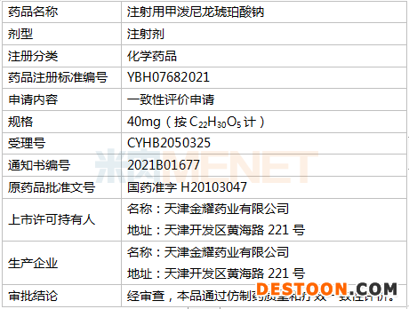 7月5日讯 7月1日,天药股份发布公告称,其子公司天津金耀药业的注射用甲泼尼龙琥珀酸钠(40mg规格)以补充申请获批过评。在此之前,天津金耀药业的注射用甲泼尼龙琥珀酸钠已有4个规格获批过评,其中,1.0g和2.0g两个规格是首家过评。米内网数据显示,2020年中国公立医疗机构终端注射用甲泼尼龙琥珀酸钠销售额近20亿元。