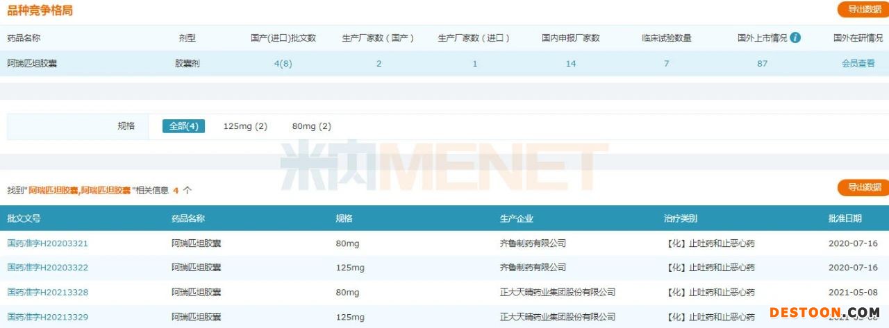 在此之前,阿瑞匹坦胶囊生产企业仅有3家,2020年7月,齐鲁制药拿下首仿;今年5月,正大天晴药业集团获批上市。此次,南京正大天晴获批,成为第3家国产企业。值得一提的是,这3家国产企业均是以仿制4类报产获批,视同过评。目前,该产品有四川海思科制药|Glenmark Pharmaceuticals Ltd.以进口5.2类报产在审评审批中。