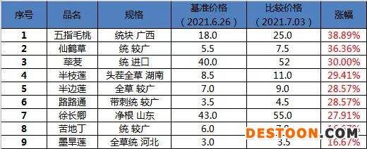 7月5日讯 2021年6月19日-6月26日,天地云图中药产业大数据中心监控的1587个品种(包括相同品种不同品规不同产地,下同)中,上涨品种数67个,较上周减少3个,下跌品种数36个,较上周减少5个,其余商品本周价格波动不大。