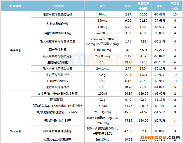 倍特药业中选的11个品种包括3款吸入剂、7款注射剂及1款口服制剂,合计采购金额超过3亿元,其中吸入用布地奈德混悬液采购金额占比超过50%;11个品种的中选企业数均达4家及以上,仅注射用艾司奥美拉唑钠、盐酸法舒地尔注射液降幅超过90%。