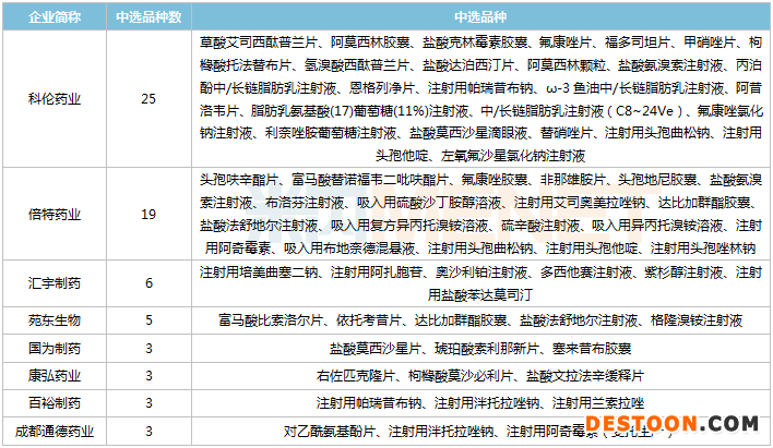 在前五批集采中,科伦药业的中选品种数分别为1个、5个、4个、4个、11个,得益于注射剂过评提速,“大输液龙头”科伦药业在第五批集采的中选品种数大幅增加。