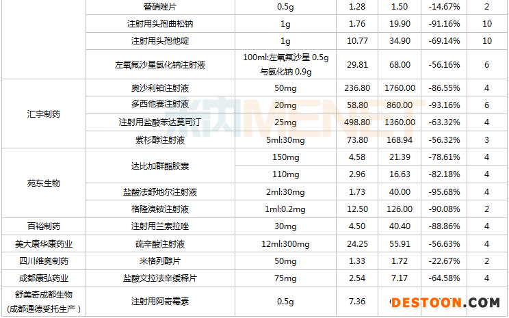 经梳理,28个药品(以品种名计)有四川药企中选,涉及34个品种(以企业%20品种计),平均降幅约69%,最高降幅95.68%,为苑东生物的盐酸法舒地尔注射液(2ml:30mg),最低降幅14.67%,为科伦药业的替硝唑片(0.5g)。