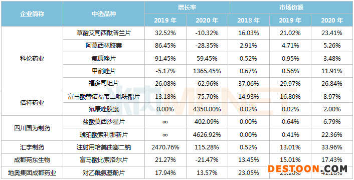 多个集采品种增速及市场份额提升,如科伦的氟康唑及甲硝唑,2020年增速分别达59.45%、1365.45%,其中甲硝唑的市场份额由2018年的0.67%上涨至2020年的11.9%;四川国为的莫西沙星及索利那新均为“光脚”品种,中选前的市场份额为0,中选后市场份额飙升,其中索利那新的增速超过4000%;汇宇制药的培美曲塞2020年销售额突破10亿元,在该药品中的市场份额由2018年的0.52%暴涨至2020年的33.96%。
