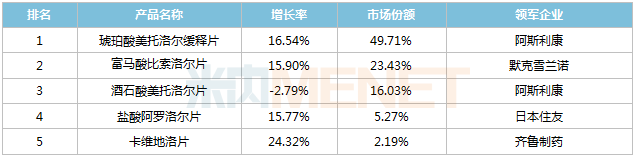 在2020年中国公立医疗机构终端β受体阻滞剂产品竞争格局中,琥珀酸美托洛尔缓释片以约46%的市场份额排位第一;在2020年中国城市实体药店终端β受体阻滞剂产品竞争格局中,琥珀酸美托洛尔缓释片以约50%的市场份额排位第一。