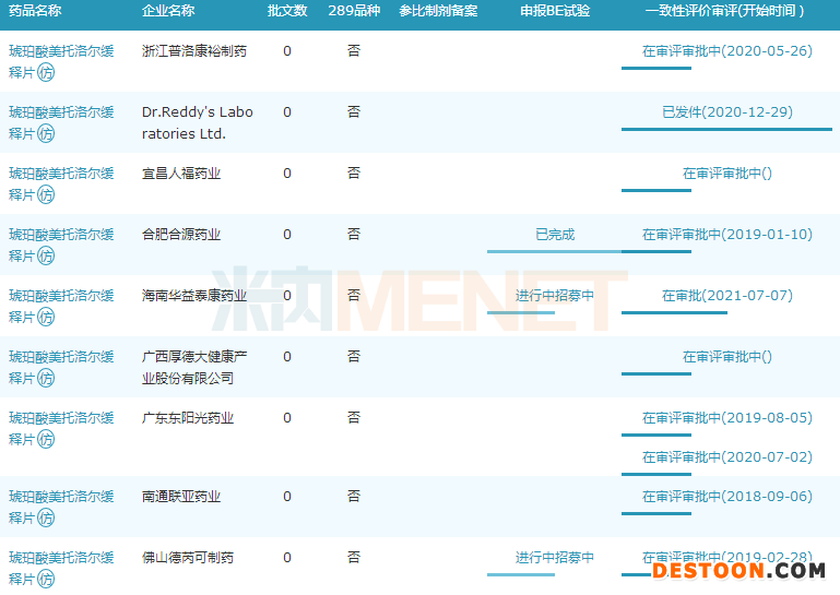 米内网数据显示,目前国内已有多家企业以新注册分类提交琥珀酸美托洛尔缓释片上市申请,包括人福、东阳光药、佛山德芮可制药、合肥合源药业、南通联亚药业、海南华益泰康药业等,其中海南华益泰康药业的产品已顺利获批,为国内首仿。