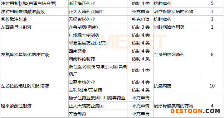 此外,盐酸右美托咪定注射液有9家企业过评;注射用阿奇霉素、注射用泮托拉唑钠有7家企业过评;多西他赛注射液、盐酸罗哌卡因注射液、注射用头孢唑林钠有6家企业过评;枸橼酸咖/啡/因注射液、利奈唑胺葡萄糖注射液、注射用地西他滨、注射用盐酸吉西他滨、左氧氟沙星氯化钠注射液均有5家企业过评。而今年上半年过评的注射剂品种中,有60个是此前并无企业过评,包括有36个是独家过评。