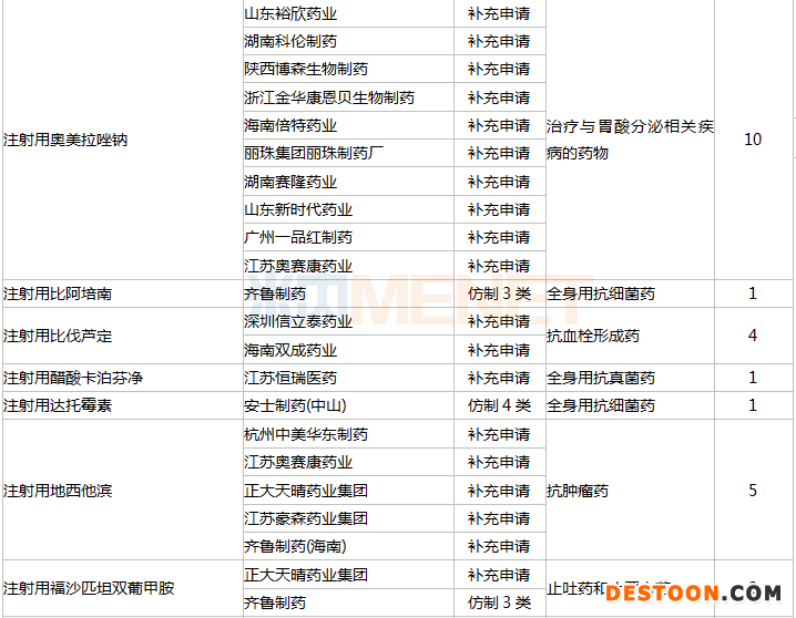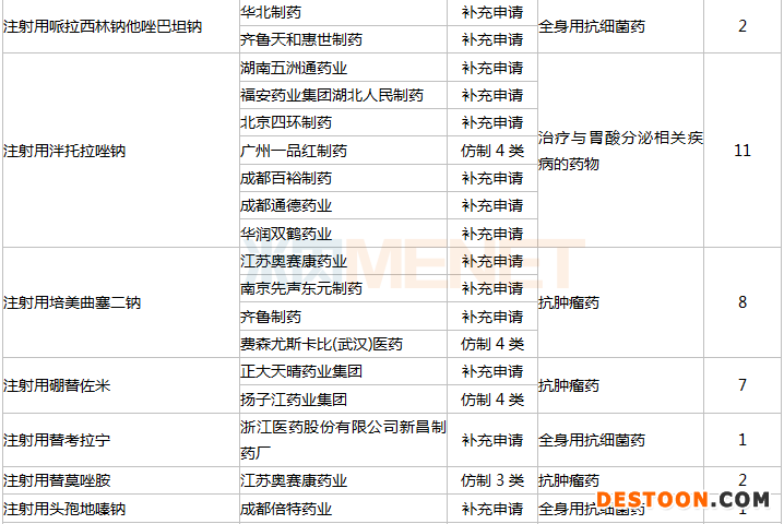 从治疗领域(亚类)来看,上半年过评的114个注射剂品种共涉及34个亚类。其中,全身用抗细菌药最多,有22个;其次是抗肿瘤药有20个。