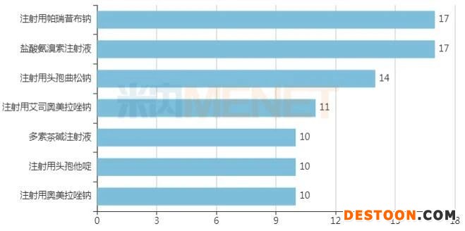 从品种过评情况来看,注射用帕瑞昔布钠、盐酸氨溴索注射液、注射用头孢曲松钠等7个品种最火,有10家及以上企业过评。除多索茶碱注射液外,其余6个注射剂品种在2020年中国公立医疗机构终端销售额均超过20亿元。