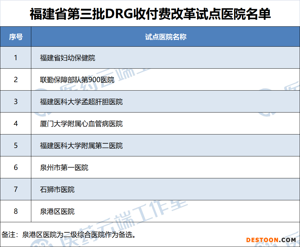 同时,确定省属、福州市、厦门市、泉州市及部队等7家三级综合公立医院纳入DRG收付费第三批改革试点范围。