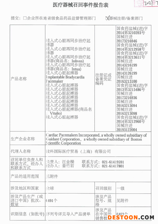值得注意的是,此次波科国际医疗贸易(上海)有限公司的植入式心脏再同步治疗起搏器产品涉及11个批号,包括国食药监械(进)字2014第3210393号;国械注进20173216946;国食药监械(进)字2014第3212958号;国食药监械(进)字2014第3213611号;国械注进20143216199;国械注进20143126199;国械注进20163213100;国食药监械(进)字2013第3215486号;国械注进20173216936;国械注进20163213094;国械注进20163213098;国食药监械(进)字2014第3212960号,国械注进20193122004等。召回等级也从二级变更为一级,上述涉及的产品在中国的销售数量为6463个。