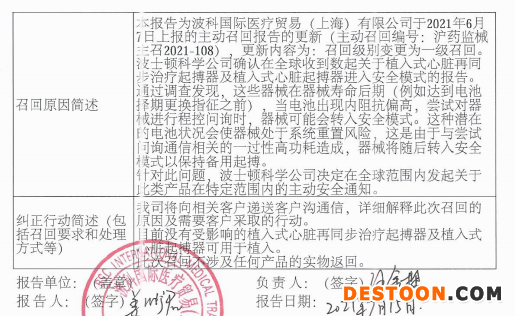 1、波科国际医疗贸易(上海)有限公司报告,由于涉及特定型号、特定批次产品,存在器械寿命后期(例如达到电池择期更换指征之前),当电池出现内阻抗偏高,尝试对器械进行程控问询时,器械可能会转入安全模式,这种潜在的电池状况会使器械处于系统重置风险的问题。波科国际医疗贸易(上海)有限公司对植入式心脏再同步治疗起搏器等产品(注册证号:国食药监械(进)字2014第3210393号;国械注进20173216946;国食药监械(进)字2014第3212958号;国食药监械(进)字2014第3213611号;国械注进20143216199;国械注进20143126199;国械注进20163213100;国食药监械(进)字2013第3215486号;国械注进20173216936;国械注进20163213094;国械注进20163213098;国食药监械(进)字2014第3212960号;国械注进20193122004)主动召回。相关产品召回信息已于2021年6月7日发布,召回级别为二级,现将召回级别变更为一级。
