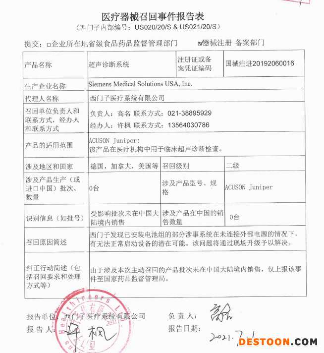 3、西门子医疗系统有限公司报告,由于涉及特定型号、特定批次产品,可能存在已安装电池组的部分涉事系统在未连接外部电源的情况下,有无法正常启动设备的潜在问题,生产商美国西门子医疗系统股份有限公司Siemens Medical Solutions USA, Inc.对超声诊断系统Diagnostic Ultrasound System(注册证号:国械注进20192060016)主动召回。召回级别为二级。