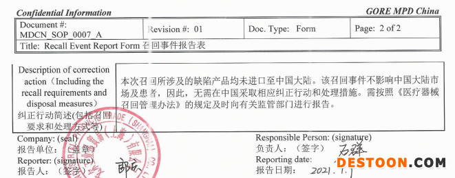 2、戈尔工业品贸易(上海)有限公司报告,由于涉及特定型号、特定批次产品,可能存在准备前测试或者使用该产品时发现导丝腔和Y型接头的尾部粘合口泄漏,导致球囊充盈不充分或无法充盈的问题,生产商戈尔及同仁有限公司对主动脉成型球囊导管Molding Balloon Catheter(注册证号:国械注进20193030645)主动召回。召回级别为二级。