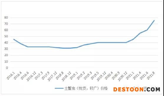 2015年底到2016年,土鳖虫价格下滑至23-25元上下,由于价格大幅回落,很多养殖户不挣钱或者亏本。2017-2018年,土鳖虫价格小幅回升至28元左右,依然没有激发起养殖户的积极性,随着库存消化,加上2020版药典实施,土鳖虫合格货少,2021年产新后价格快速上涨。