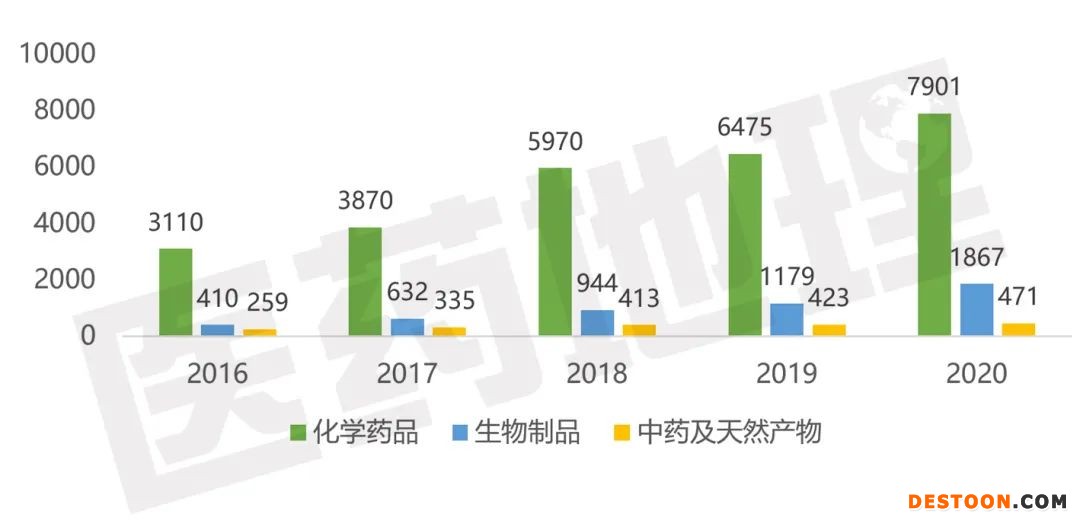 聚焦中国市场。2020年国家药品审评中心共受理各类药品新注册申报10239件,注册申请数量持续攀升,较2019年同比增长了26.8%。总体上,2020年的药品注册申报主要集中在化学药品领域,注册申请受理量为7901件,较2019年增长22.0%,占比达到77.2%,其次是生物制品1867件,较2019年增长58.4%,占比为18.2%,最后为中药及天然产物共471件,较2019年增长11.3%,占比为4.6%。从生物制品超50%的增加量可以看出,由于全球新冠疫情的影响,我国医药产业进一步加大了对生物制品领域的关注和投入,尤其新冠病毒疫苗和新冠肺炎治疗有关药物,为新冠肺炎的防治提供了有力支持。