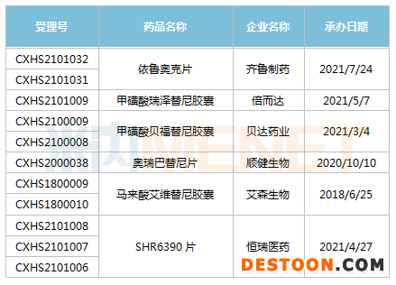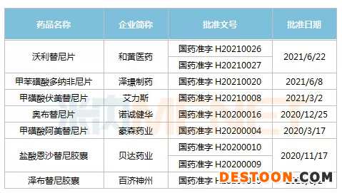 2020年至今国内企业蛋白激酶抑制剂获批情况