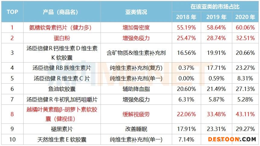 公司的另一个具有市场领导地位的单品是健视佳(越橘叶黄素酯β-胡萝卜素软胶囊),2020年在缓解视疲劳市场已占据43.11%的份额,汤臣倍健表示,目前该产品正由区域推广扩充到全国推广,未来有望继续扩大领导地位。