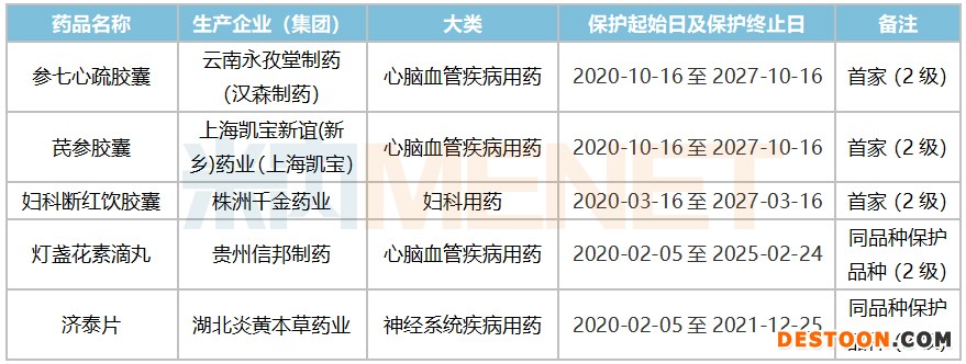 2020年,NMPA仅发布了两次中药保护品种公告,共有5个产品获得批准保护,其中参七心疏胶囊、芪参胶囊、妇科断红饮胶囊为首家中药2级保护品种,保护期限自公告日起七年,灯盏花素滴丸和济泰片为同品种保护品种,保护终止日与同品种首家的终止日一致。