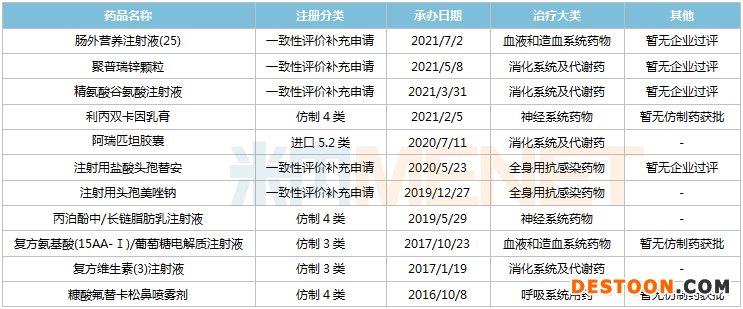 在审品种中,5个品种提交了一致性评价补充申请,除了注射用头孢美唑钠外,其余品种暂无企业过评;6个品种以新注册分类报产,糠酸氟替卡松鼻喷雾剂、复方氨基酸(15AA-Ⅰ)/葡萄糖电解质注射液、利丙双卡因乳膏3个品种暂无仿制药获批,其中糠酸氟替卡松鼻喷雾剂、利丙双卡因乳膏为海思科首家/独家报产。