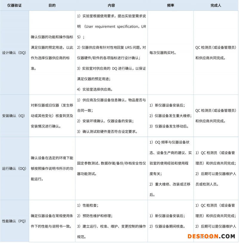 仪器运行之前的一系列工作可称之为“仪确证”[2],由GMP规范和《检测和校准实验室能力认可准则》可知,“仪器确证”工作是检测实验室质量保证的重要途径,需QC相关人员配合完成对应的实验和文件。仪器确证是实验室对仪器进行的生命周期全过程管理,通常用4Q确认的方式来体现,即DQ、IQ、OQ、PQ,具体内容见表2。