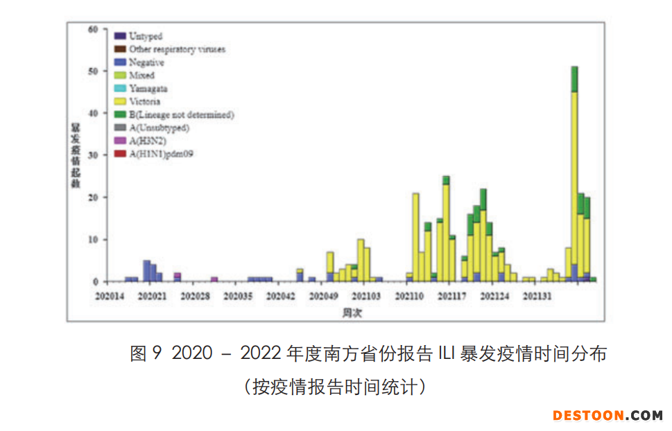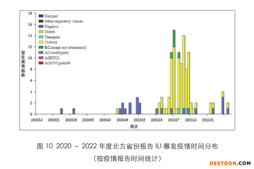 其中,南方省份共报告 261 起 ILI 暴发疫情,北方省份共报告 100 起 ILI 暴发疫情,南北省份报告疫情数均高于2020年同期报告疫情数。